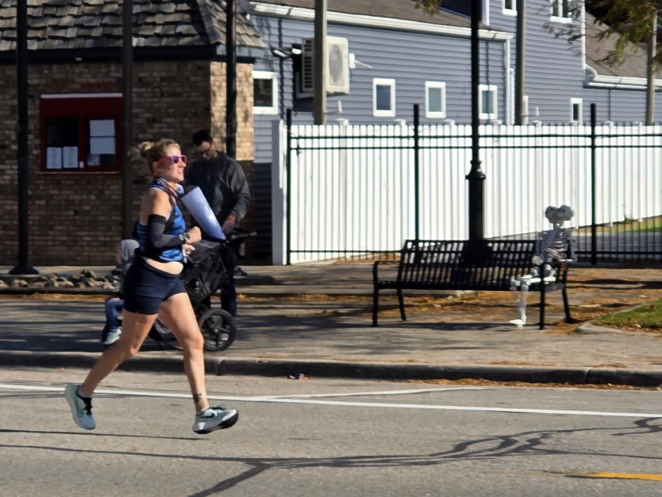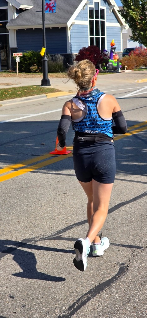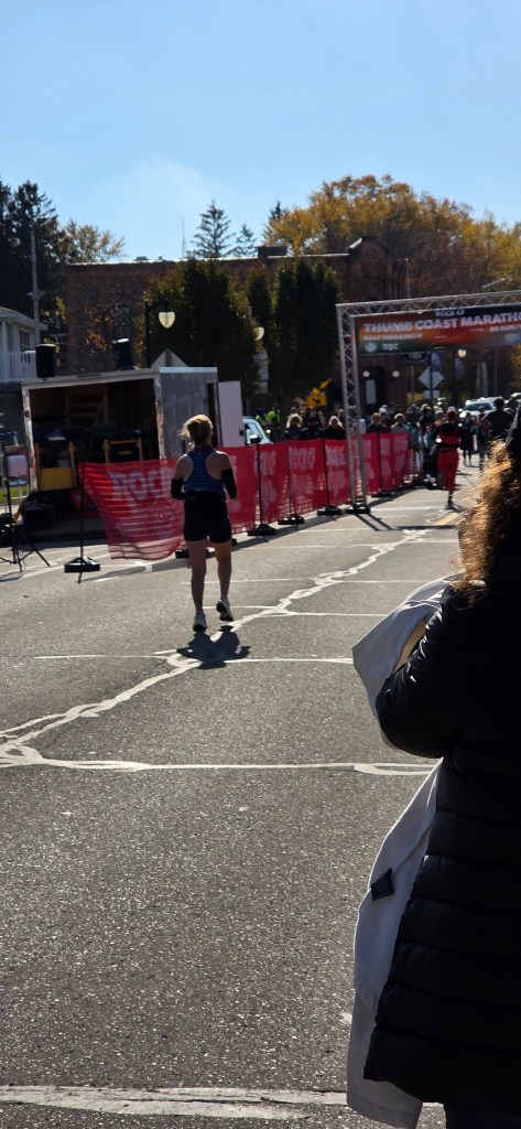 I ran the first few miles at around an 8:50/8:55 per mile pace. Everything was feeling good and I kept that pace up for a while. The course was along M-25, right off of Lake Huron. After the first few miles, I was able to see sprawling views of the dark blue waters of Lake Huron, lined with trees that were fully blooming in their red, orange, and yellow fall colors. Each mile, I asked myself (like my coach recommended), “is this pace sustainable?”