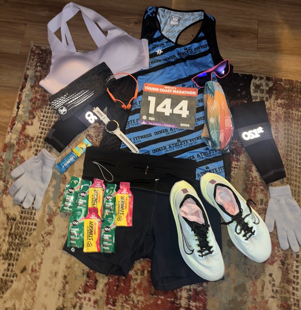 I gathered all my race essentials (gels, FlipBelt, headphones, sunglasses, bib, etc.) and got dressed into my shorts and race tank.